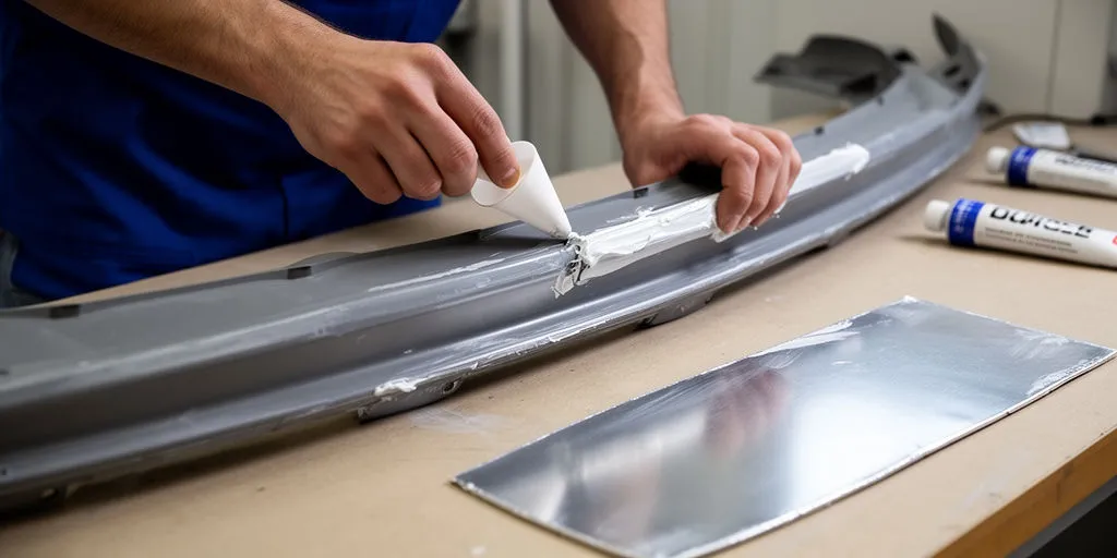 1) Склейка бампера (ABS) после трещины: очистка и матирование краёв, нанесение праймера для ABS, использование структурного клея для пластика, закрепление шпильками до полного отверждения 12–24 ч.