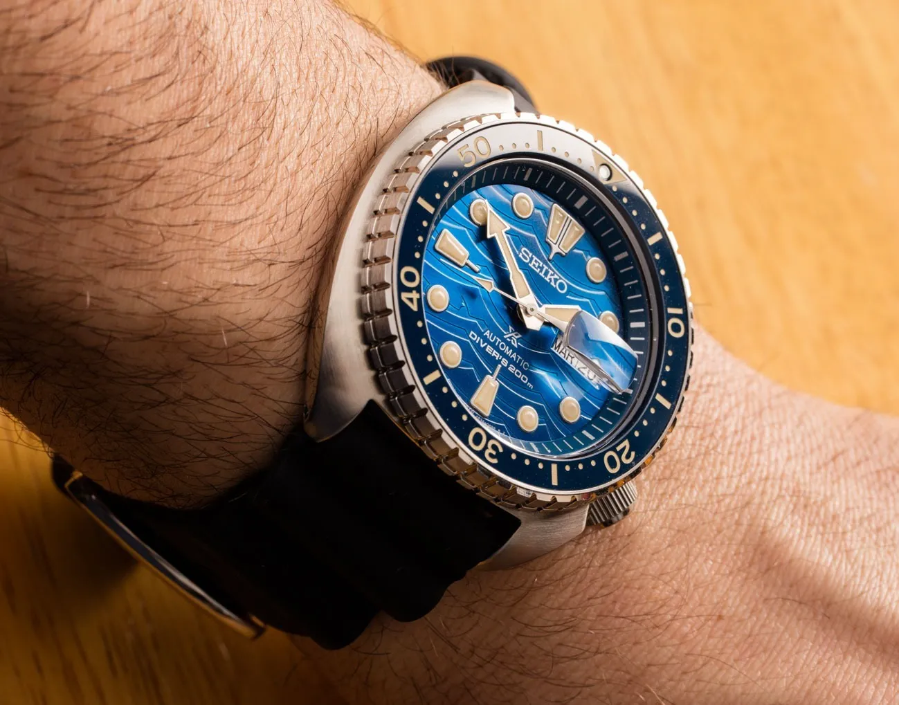 Прозвище «Turtle» (черепаха) модель получила за характерную форму корпуса: широкий, почти квадратный, с плавными скруглениями по краям. Такой дизайн не просто красив — он исключительно удобен. Часы плотно сидят на запястье, не цепляются за рукава и не давят, что особенно ценно при активной эксплуатации. История Turtle уходит корнями в 1970-е годы, когда Seiko представила первую дайверскую модель с таким корпусом. Современная версия сохранила всё самое лучшее: водозащиту до 200 метров, автоматический механизм и фирменный безель с чёткой разметкой.